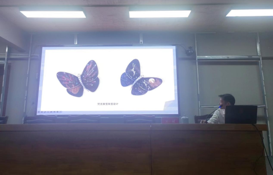 宾斌给师生带来了《大漆髹饰工艺的历史沿革》,他从“什么是大漆”“漆艺发展历史””现代漆艺”三个方面解读了大漆髹饰工艺的历史沿革,脉络清晰,内容精彩。他认为大漆所髹涂的艺术品,美感谦冲而温厚、含蓄而神秘,接近诗的意境和诗教传统,大漆艺术品的气质,正是中国人温柔敦厚气质的折射。从新石器时期到夏、商、周、春秋再到明清时期,在漫长的历史岁月中,中华民族智慧的先民运用天然漆这种媒材,创立了多种多样的髹漆技法,创作了大量的优秀漆艺作品。他认为,当代的漆艺家积极探索,在继承传统漆艺的基础上,充分发挥天然漆的独特优势,融入新时代的创意思维和审美意识,创作出具有当代艺术特色的漆艺作品,使其成为独立于其他艺术形式,而又兼容并蓄、多元发展的艺术形态。最后,他还分享了《梵克雅宝珠宝设计》《观自在》等多种形态的漆艺作品。