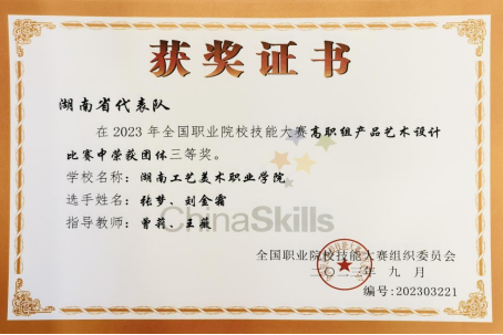9月7日至9月9日,为期3天的2023年全国职业院校技能大赛(高职组)“产品艺术设计”赛项在上海工艺美术职业学院举办。由曾莉、王薇指导的张梦、刘金霜团队从全国59支参赛队伍中脱颖而出,荣获全国职业院校技能大赛高职组“产品艺术设计”赛项三等奖。