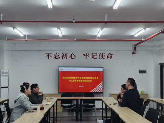 2024年3月12日,湖南益丰优品智能科技有限公司刘崇高一行3人来到长沙基地交流考察,手工艺术学院副院长王飞、胡毓轩,产品艺术设计专业教师周婷、王薇、彭淋莹热情接待。双方在202会议室就深入开展产教融合、校企合作进行洽谈。