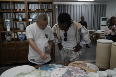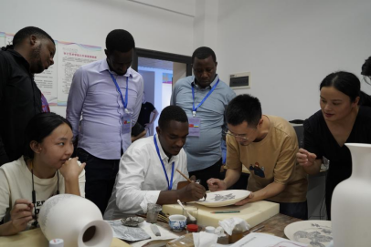 欧阳霖欣老师指导南非和卢旺达学员进行陶瓷釉上彩绘体验