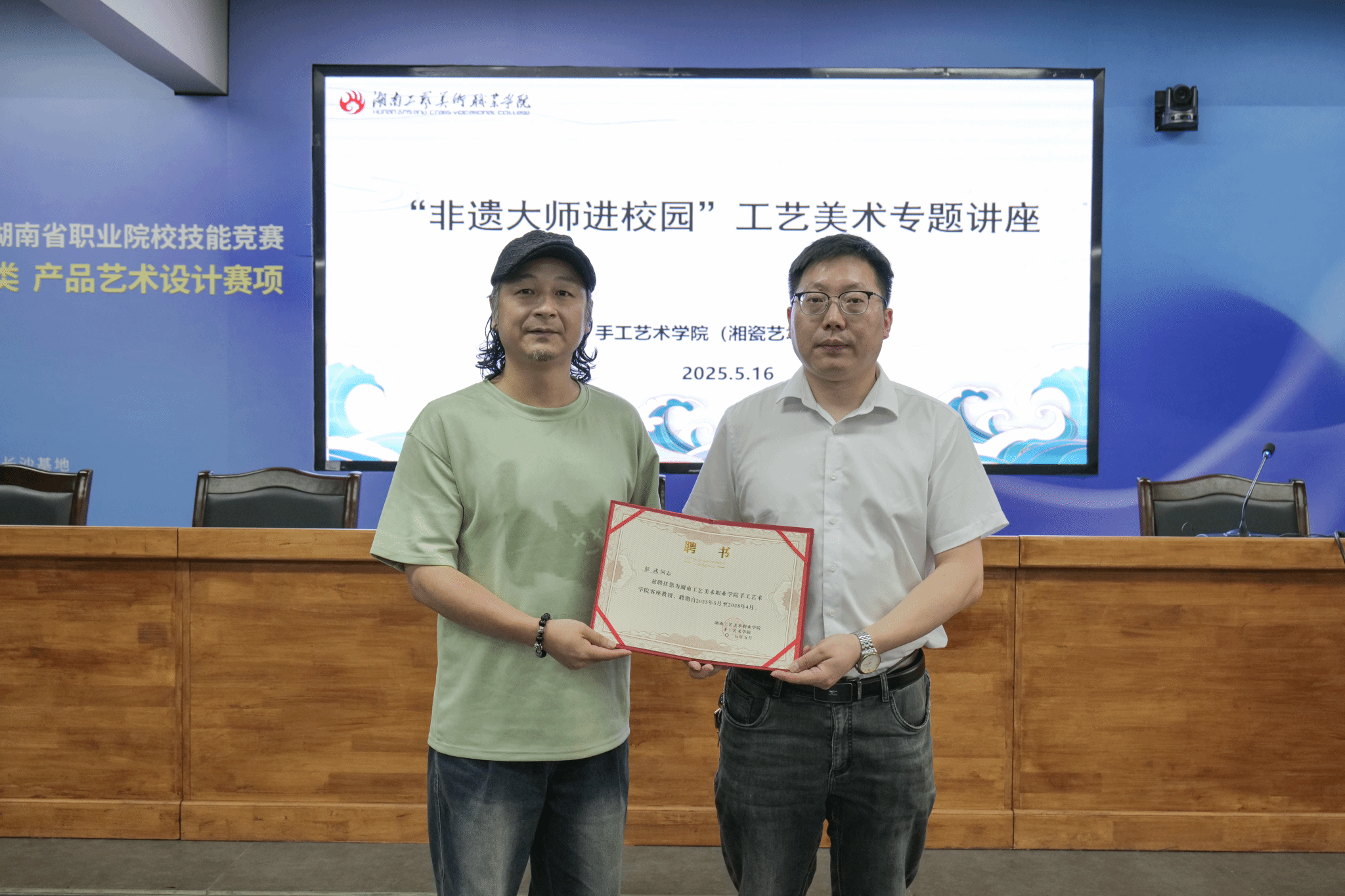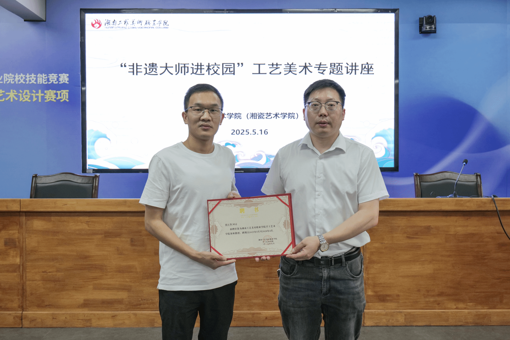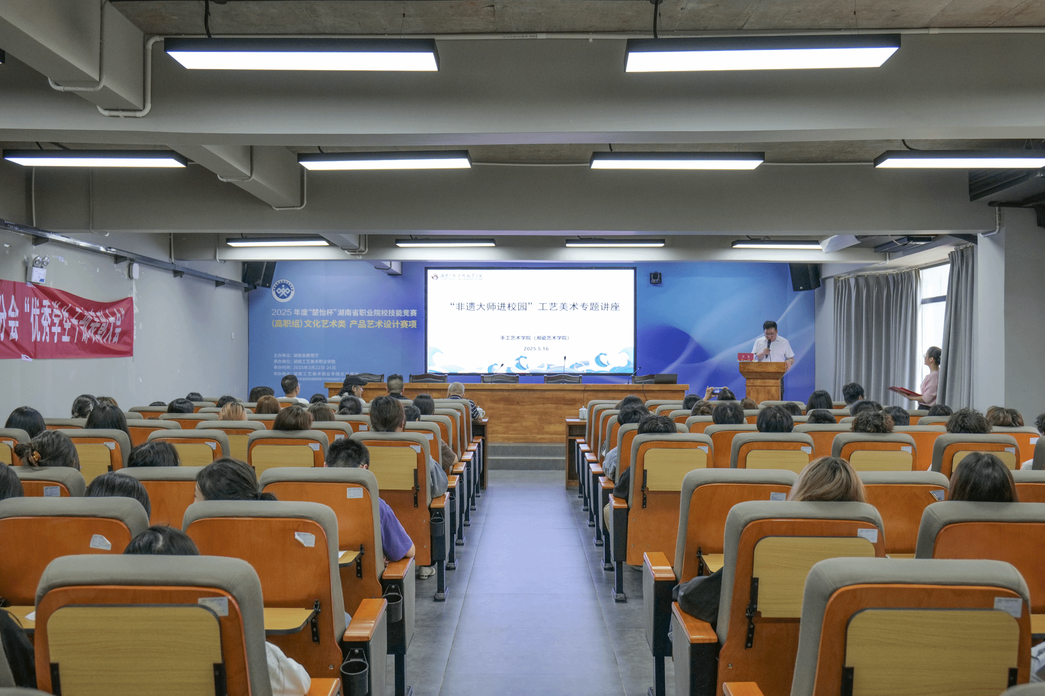 为了增进学生对工艺美术和湖湘非遗的了解,近距离感受大师的工匠精神,开阔师生视野,提高师生的理论修养与艺术创作水平,2025年5月16日下午手工艺术学院(湘瓷艺术学院)在长沙基地综合办三楼学术报告厅开展了“非遗大师进校园”系列专题学术讲座,来自陶瓷行业企业的三位大师魏楚斌、彭武、丁建国分别以《陶瓷装饰与绘画》、《工艺美术创意与表达》《中国工艺美术行业发展趋势与醴瓷现状》为题作了专题讲座。此次讲座由副院长王飞主持,陶瓷、工艺品、产品等专业一百余名师生共同聆听了此次讲座。