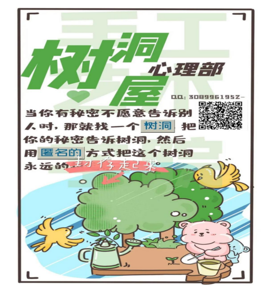 为了加强同学们的健康教育心理素质发展,认真落实学校大学生心理健康活动,加强我院大学生心理健康教育工作,更好引导学生关注自身发展,树立正确的世界观,人生观、价值观,给我院心理健康教育工作创造一个良好的氛围,促进大学生健康成长,我院创立心理部“树洞屋”,于2021年10月10号拉开序幕。