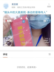 我院以“镜头中的大美美院·身边的雷锋传人”为话题的线上活动。为了保护校园以及城市的环境,同学们积极做了打扫校园垃圾,见到垃圾随手捡起丢进垃圾桶的习惯,为所居环境的改善贡献力量,用实际行动留住绿水青山。