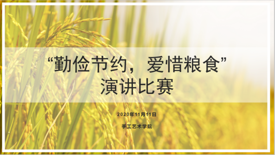 为教育引导全体师生充分认识节约粮食、杜绝浪费的重大意义,培育勤俭节约、珍惜劳动成果的良好习惯。2020年11月11日晚上,手工艺术学院举办“勤俭节约,爱惜粮食”主题演讲比赛。
