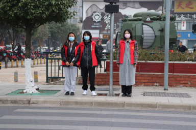 同学们在校外的路口维护交通安全,护送中小学生过马路;把学校周边乱停乱放的共享电动车辆摆放整齐,严格遵守道路交通安全法规,以实际行动倡导“守法规知礼让 安全文明出行”。