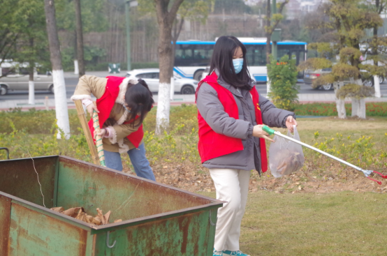 在星沙生态公园里志愿者们用扫把用双手拾起地面上的残叶、垃圾。风的到来让新翻的泥土气息混着青草味儿,还有各种花香,在整个公园飘荡。