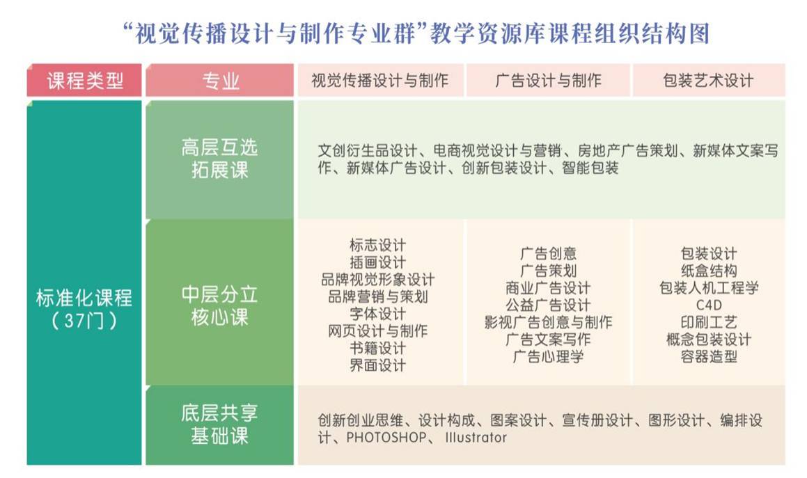 视觉传播设计与制作专业群教学资源库规划共建37门标准化课程、11620条各类素材资源。37门标准化课程中,底层共享基础课包括《创新创业思维》《设计构成》《IIIustrator》等8门课程;中层分立核心课程包含《品牌视觉形象设计》《插画设计》《广告创意》《书籍设计》《标志设计》等22门课程;高层互选拓展课程包含《文创衍生品设计》《电商视觉设计与营销》等7门课程。