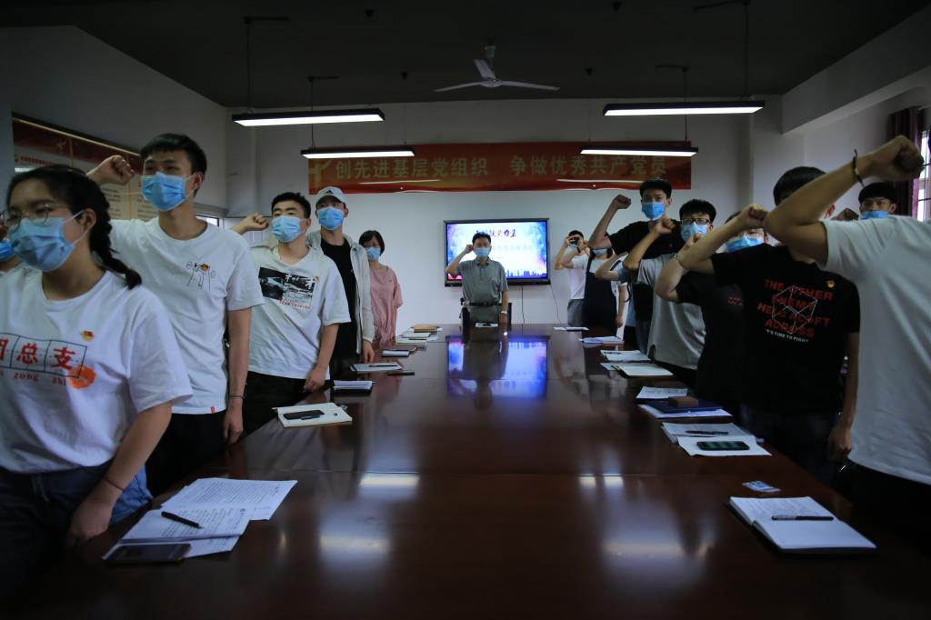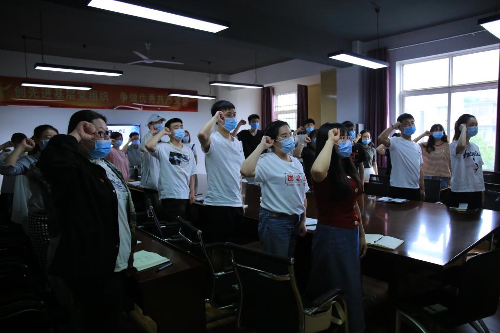 随后,与会全体党员面向党旗,庄严宣誓,重温入党誓词。