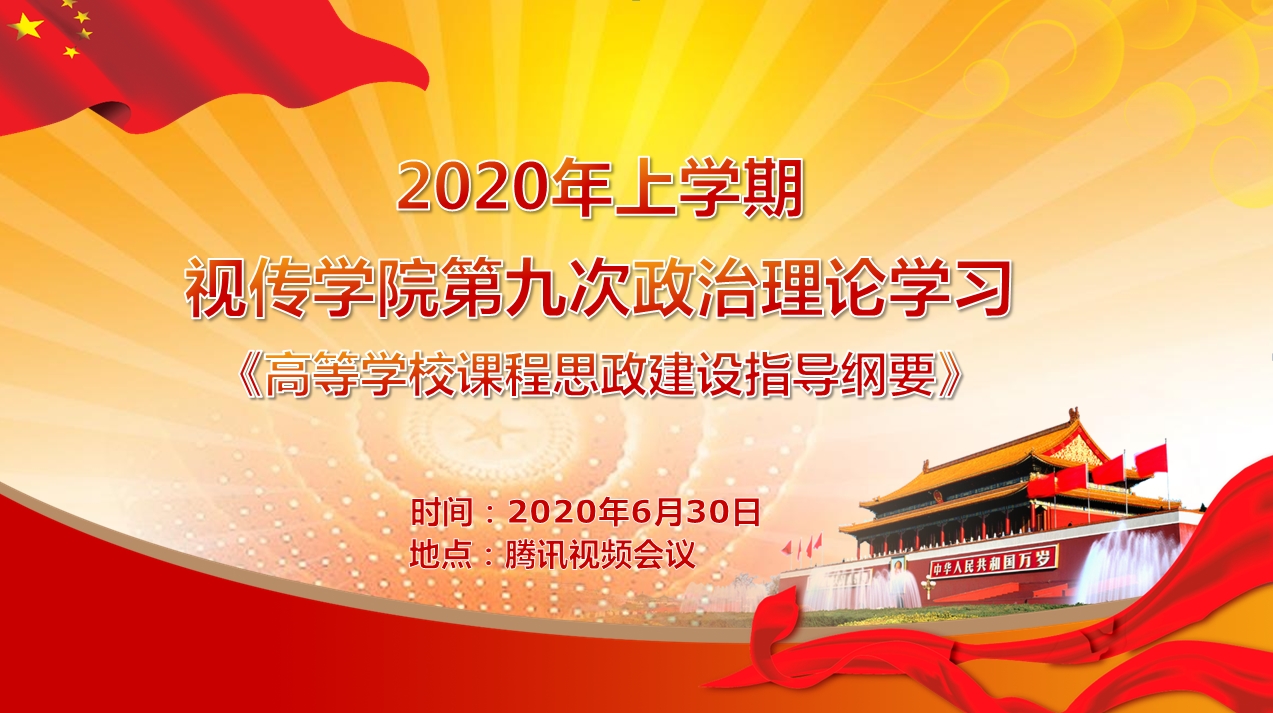 2020年6月30日下午,视觉传播设计学院组织全院教职工进行了本学期第九次线上政治理论学习,会议专题学习了《高等学校课程思政建设指导纲要》。本次学习由视觉传播设计学院党总支书记张晓安主持,组织员葛慧同志领学,视觉传播设计学院全体教职工参加了会议。