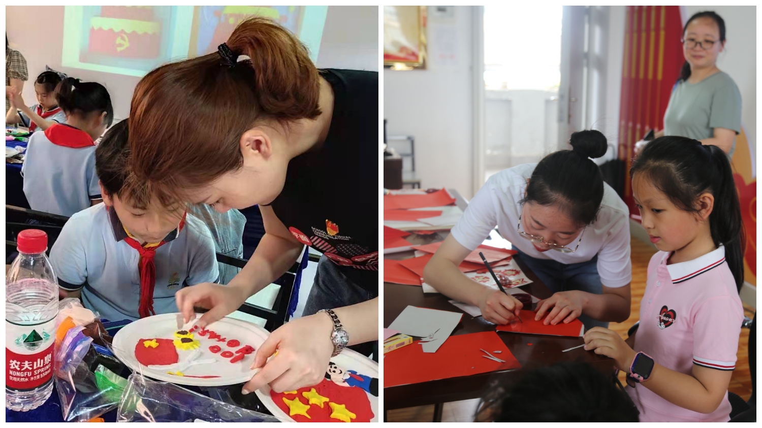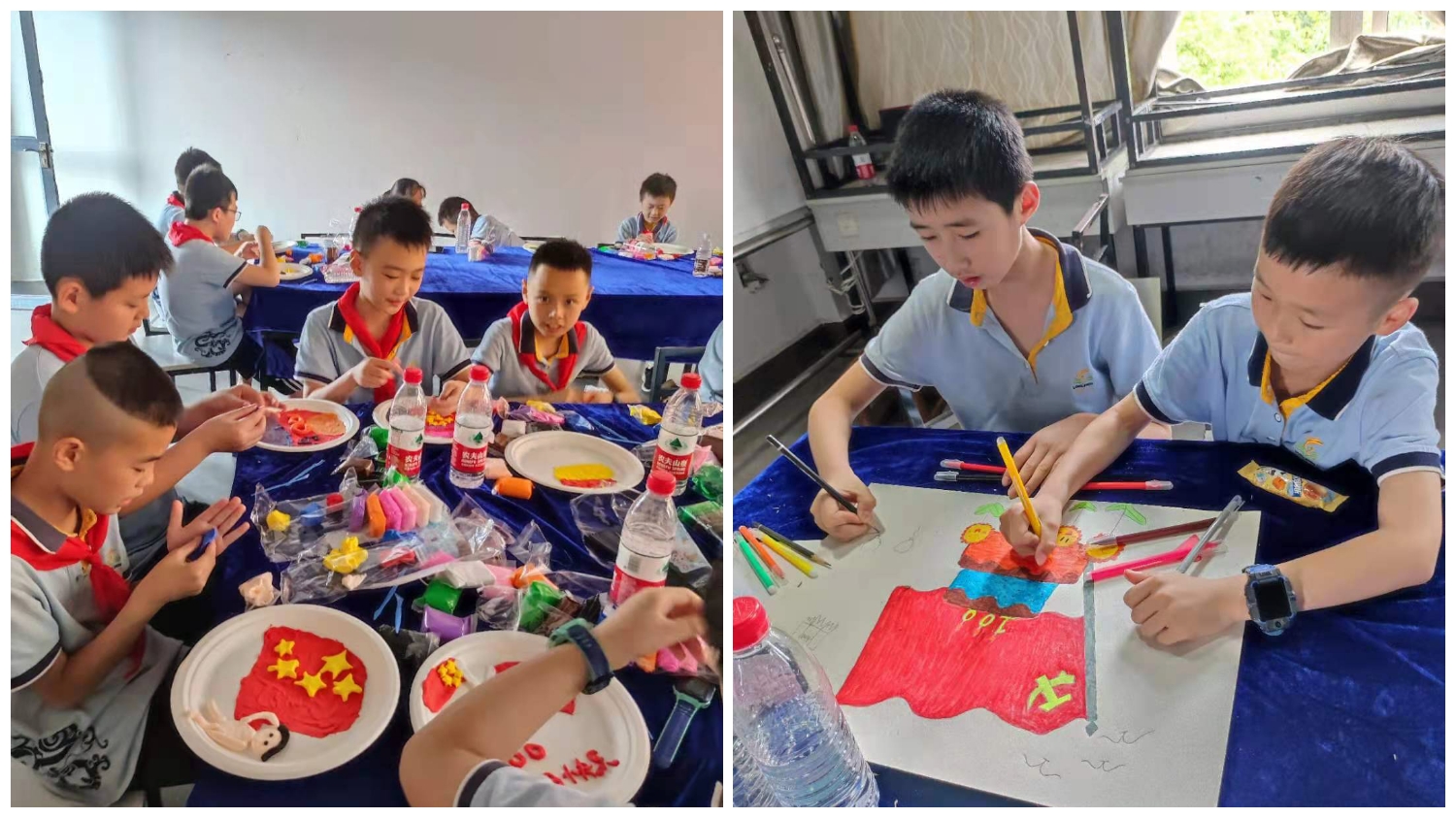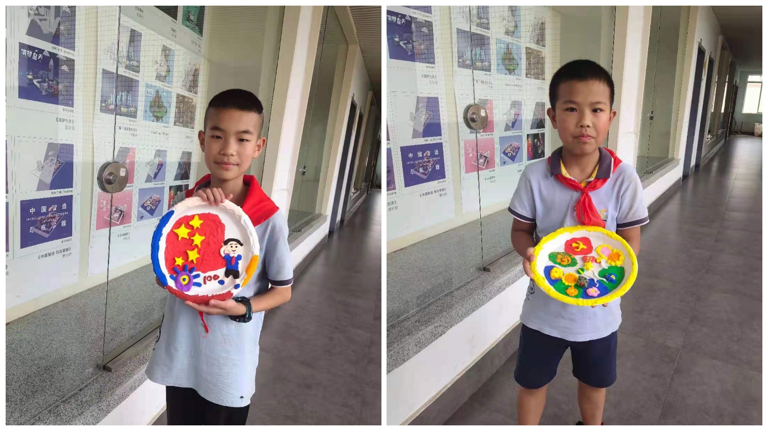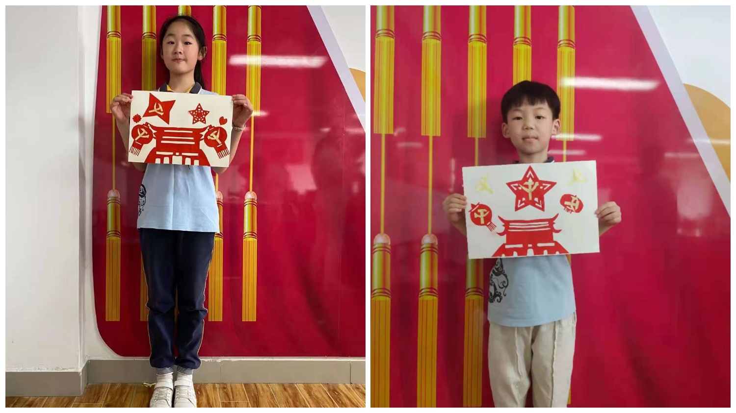 最后,我院还精心安排了以“庆祝建党100周年”为主题的手工制作红色主题设计作品环节,为学生们准备了创作材料,并设置了创意画组、创意T恤创作组、剪纸组和黏土组,按照小学生喜好,分别在弘美楼402室、403室和404室开展设计制作,视传学院部分党员师生作为指导老师全程参与。孩子们在视传学院师生党员们的指导下,结合对中国共产党的所思所感认真构思,积极开展创作,在欢乐而和谐的氛围中,孩子们有的绘出了精美的画作,有的用剪纸剪出了天安门和党徽,有的用黏土制作出了红色主题创意画。在创作过程中,孩子们增进了对党的认识和感情。