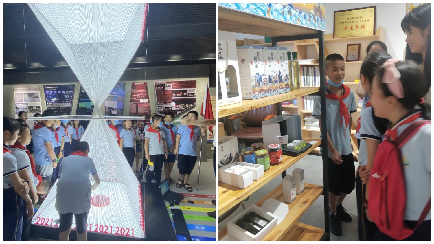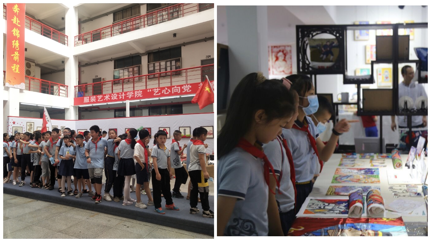上午8点20分,龙洲小学1705中队师生一行抵达湖南工艺美院,早在等候迎接的黄璜院长、葛慧副书记带领党员教师们为学生们测量体温后引导入校。孩子们漫步在大校园,顿时充满了欢快的气氛,往日书声朗朗的校园,顿时成为了处处有乐趣、有惊喜的欢乐园。在视觉传播设计学院、环境艺术设计学院和服装艺术设计学院三个展厅中,学生们兴致昂扬,认真聆听讲解,每到一处,看到一幅幅艺术作品、一个个荣誉奖状,让本感觉遥不可及的艺术殿堂变得触手可及、立体起来,也让学生们感受到了浓浓的中国传统文化、中国精神和工匠精神。在聆听中奋进,在学习中成长。随后在弘美楼402、403室,进行了生动有趣的党课环节,我院学生党员周杨杰和喻慧文深情讲述了抗日战争的小八路“王二小”“新中国最小的烈士‘小萝卜头’的故事,用小学生喜闻乐见、通俗易懂的语言讲解了为什么加入中国共产党、如何成为一名合格的共产党员、红领巾是党旗的一部分等内容,教育引导小学生们认识到今天幸福生活来之不易,要坚定不移听党话、跟党走,做新时代好少年。