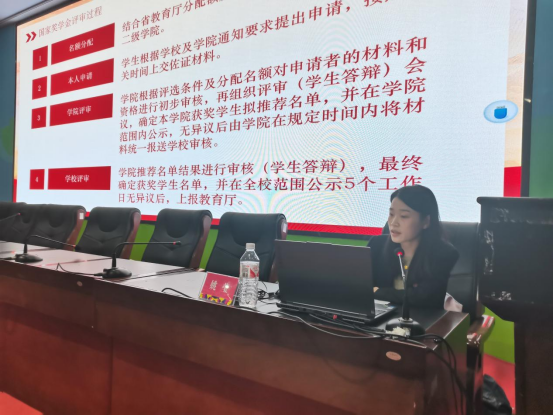 最后,辅导员姚莹老师围绕国家奖学金、国家励志奖学金、学校综合奖学金和学校三好优干四个方面,从评选对象、评选条件、评选过程三个维度进行了详细解读。