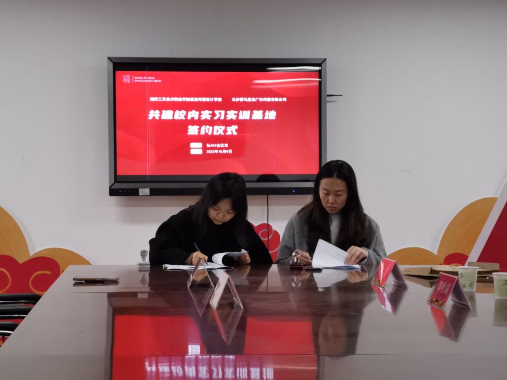 为充分发挥校企双方的优势,深化校企合作、产教融合的协同育人模式,为学生实习、实训、就业提供更大空间,10月9日下午,共建校内实习实训基地签约仪式在弘美楼四楼会议室举行。视觉传播设计学院院长黄璜、党总支书记汤灿出席活动。长沙禄马星辰广告传媒有限公司林芝总经理出席签约仪式。