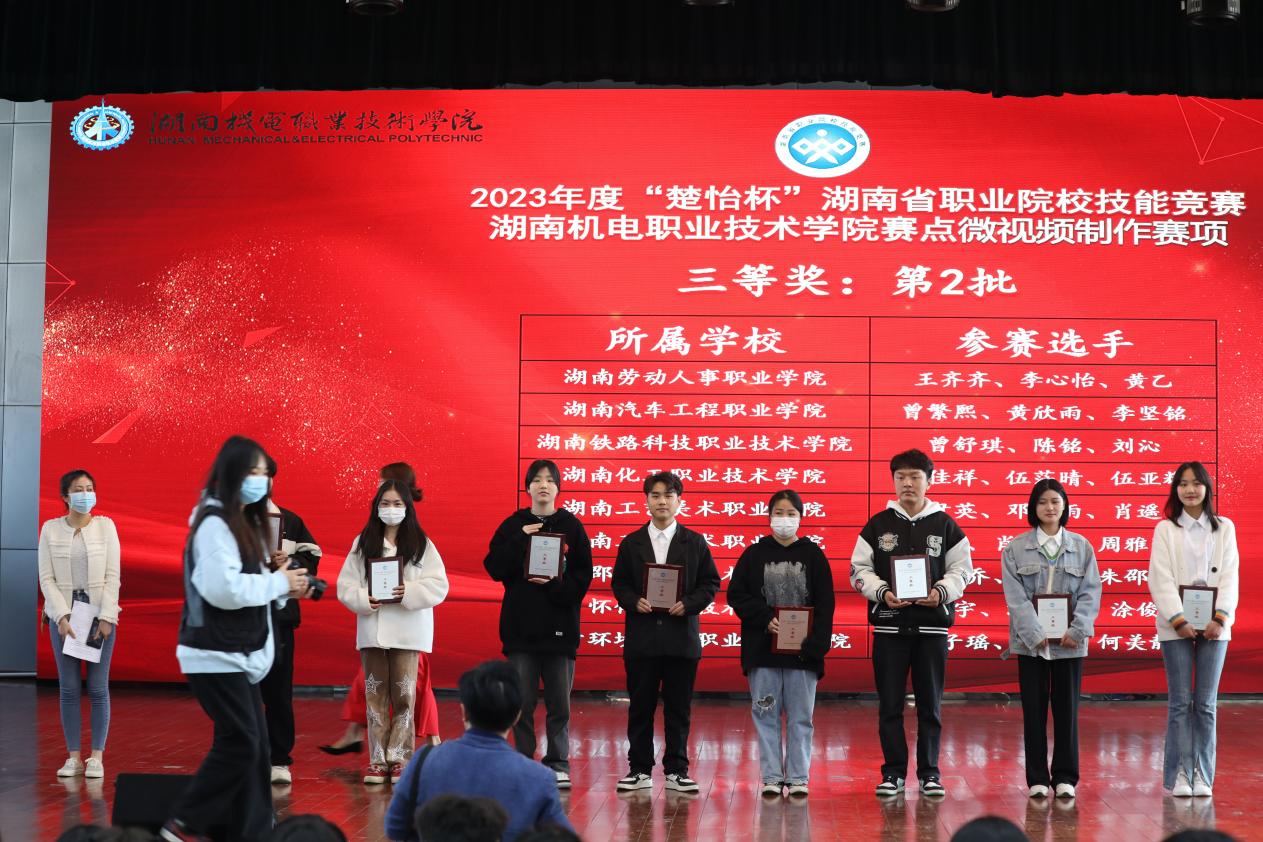 3月4日晚,2023年度“楚怡杯”湖南省职业院校技能竞赛高职组微视频制作赛项在湖南机电职业技术学院圆满落下帷幕,我院蔡蕙心、周亚平老师团队指导的学生包磊、肖龙华、周雅萱荣获三等奖。