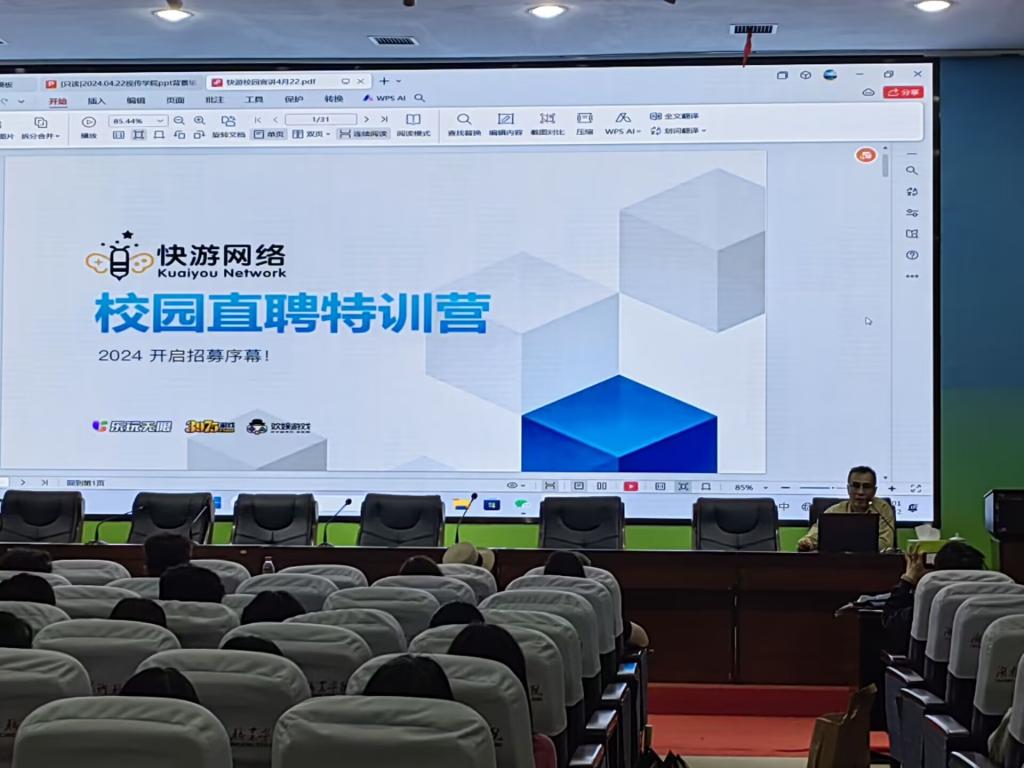在实习岗位推荐环节,学校优秀校友、2000届装潢专业毕业生、来自快游网络(三九互娱子公司)的罗总分享了校园直聘特训营活动。罗总从企业简介、职位需求情况(视频设计师、游戏主播、产品运营)、福利待遇、岗位晋升方向、员工培训、助学金等方面介绍了公司对人才特训营的总体安排,并结合自身的成长历程分享了求职应聘的宝贵经验,期待学弟学妹们加入公司大家庭。