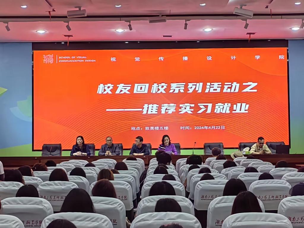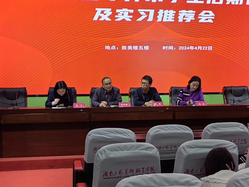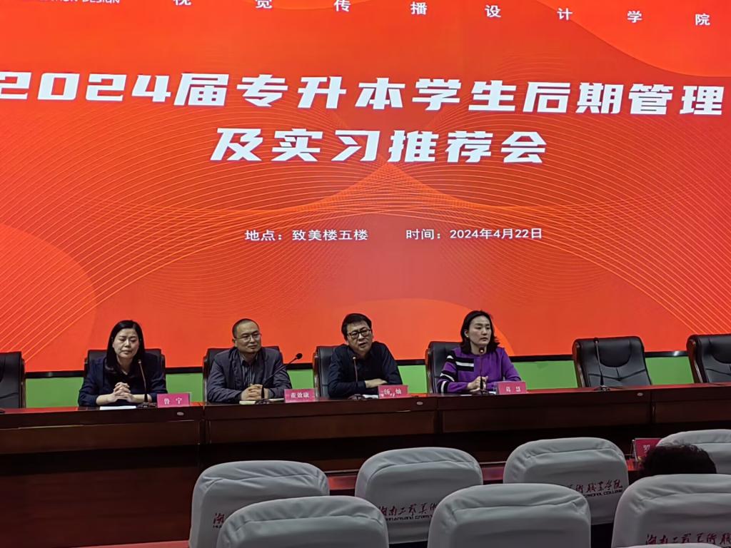 为进一步做好2024届专升本学生实习管理,促进学生早就业、就好业,4月22日晚6点30分,在致美楼五楼学术报告厅,视传学院召开2024届专升本学生后期管理及实习推荐会。学院特邀优秀校友、三九互娱集团罗毅,长沙盛隆科技李杨、戴小艳一行三人来校开展校园实习岗位推荐会。学院党政领导、毕业班实习指导老师及辅导员,2024届专升本学生、平面和新媒体大二学生等参加会议。会议由学院党总支副书记葛慧主持。