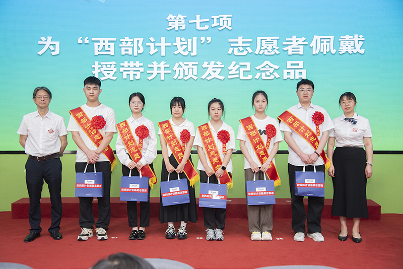 学校毕业生主动报名湖南省大学生志愿服务西部计划,今年,姚雨欣等6名毕业生将赴新疆等地投身基层社会治理、助力乡村振兴,用脚步丈量祖国大地,让青春之花绽放在祖国最需要的地方。陈鸿俊、夏能权为西部计划志愿者佩戴绶带并颁发纪念品。