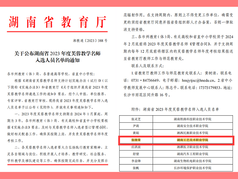 近日,湖南省教育厅发布了《关于公布湖南省2023年度芙蓉教学名师入选人员名单的通知》,经个人申报、单位推荐、专家评审、省教育厅审核,学校服装艺术设计学院教师张继荣教授入选为湖南省2023年度芙蓉教学名师。此次全省共评选出100余名芙蓉教学名师,这是学校高水平师资队伍建设的又一硕果。