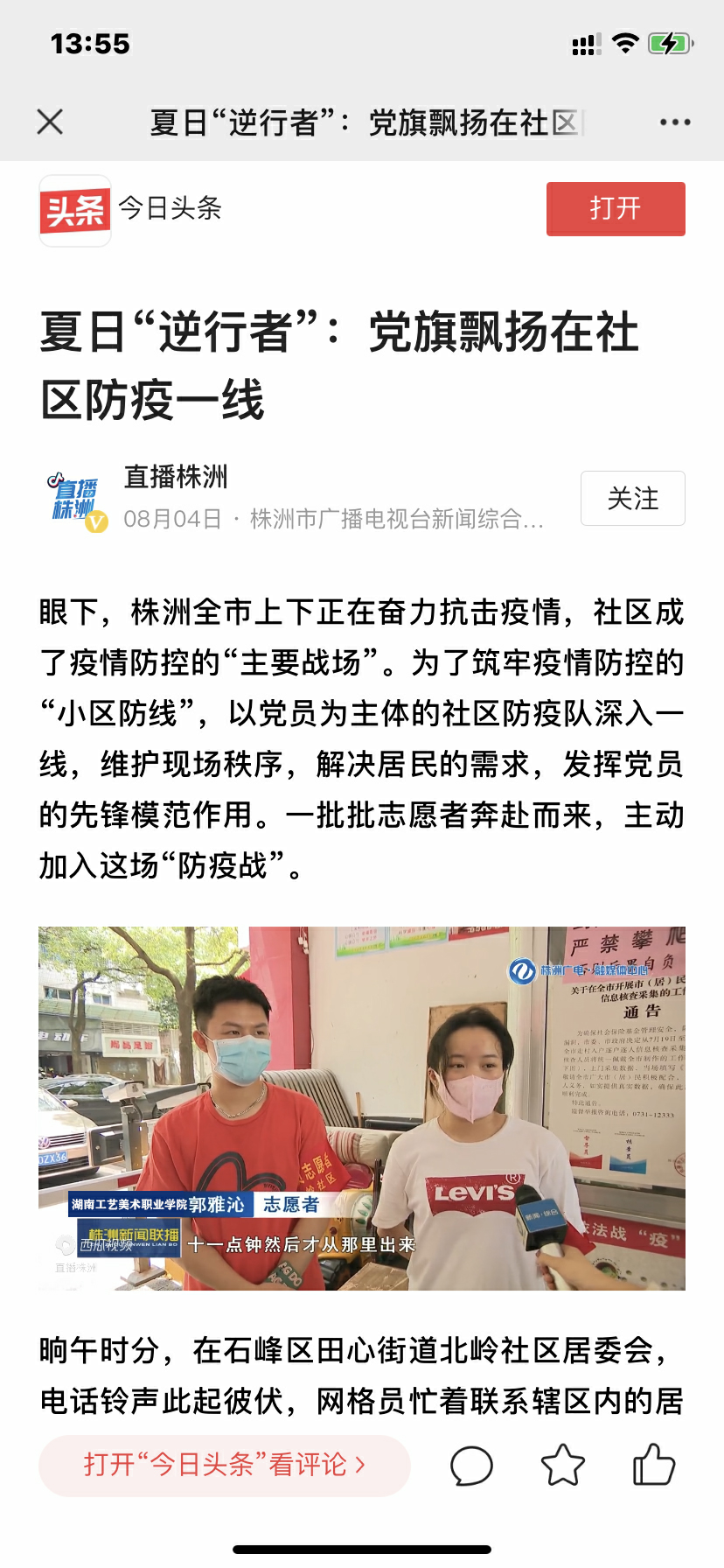 我院学生抗击疫情志愿者活动获得今日头条报道