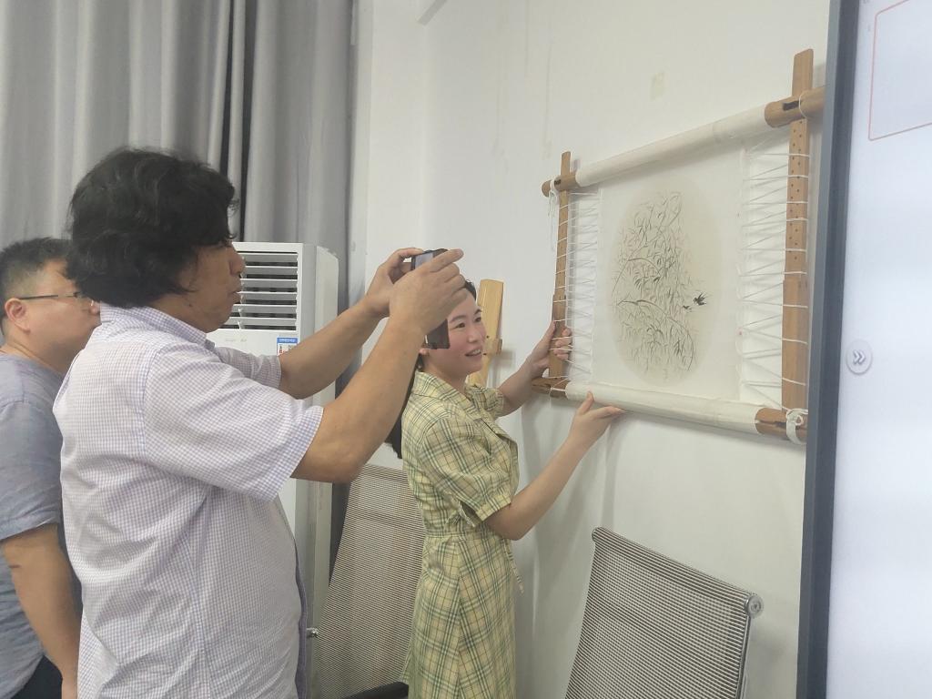 林乐成教授通过分享红色主题作品《长征路上》的创作思路和体会,从不同层次、不同方面为大家解读他对刺绣艺术创作的理解,并点评上阶段老师们的原创湘绣作品,引导参培教师对湘绣原创作品的研发方向展开积极讨论,强化了参培教师绣稿创作的思路和创作表达的方式,激发了创作兴趣,拓展了视野。