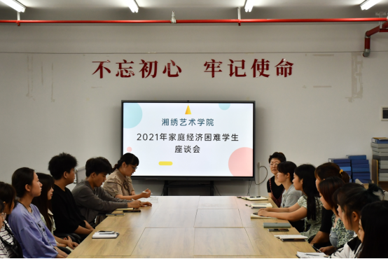 7月2日上午,湘绣艺术学院在长沙基地301会议室召开家庭经济困难学生座谈会。学院党总支副书记蔡胜男、学工办主任杨荣、招生就业专干朱婷及60余名学生代表参加了座谈会。