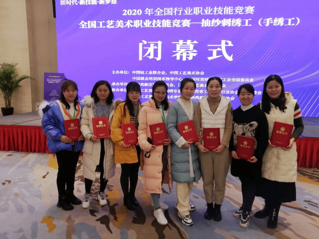 2020年12月25日,由中国轻工业联合会、中国工艺美术协会、中国就业培训技术指导中心、中国财贸轻纺烟草工会全国委员会主办的2020年全国行业职业技能竞赛——全国工艺美术职业技能竞赛(抽纱刺绣工)在苏州顺利闭幕。来自全国12个省,通过比赛精心挑选出50名一线精英在抽纱刺绣工(手绣工)项目中展开角逐,经过13小时实操、1小时理论的激烈比拼,湖南代表队8名选手,均为我校毕业生,在比赛中脱颖而出,全员获奖,其中6名进入前10。我校湘绣艺术学院教师刘艳冰、刘霞、罗剑英、吴晶慧(湘绣专业留校毕业生),分别获得第一、五、七、九名的优异成绩;另外4名湖南代表队选手彭娟、周偲、李小艳、田春艳系湘绣艺术学院往届毕业生,代表其所在企业参赛,获得第三、六、十七、二十六名的好成绩。据悉,获得竞赛第一名的刘艳冰和第三名的彭娟,将报请国家人力资源和社会保障部核准,授予“全国技术能手" 荣誉称号。刘霞、周偲、罗剑英、吴晶慧由中国轻工联合会授予“全国轻工技术能手”荣誉称号。李小艳、田春艳由中国工艺美术协会颁发“工艺美术行业技术能手”荣誉称号。