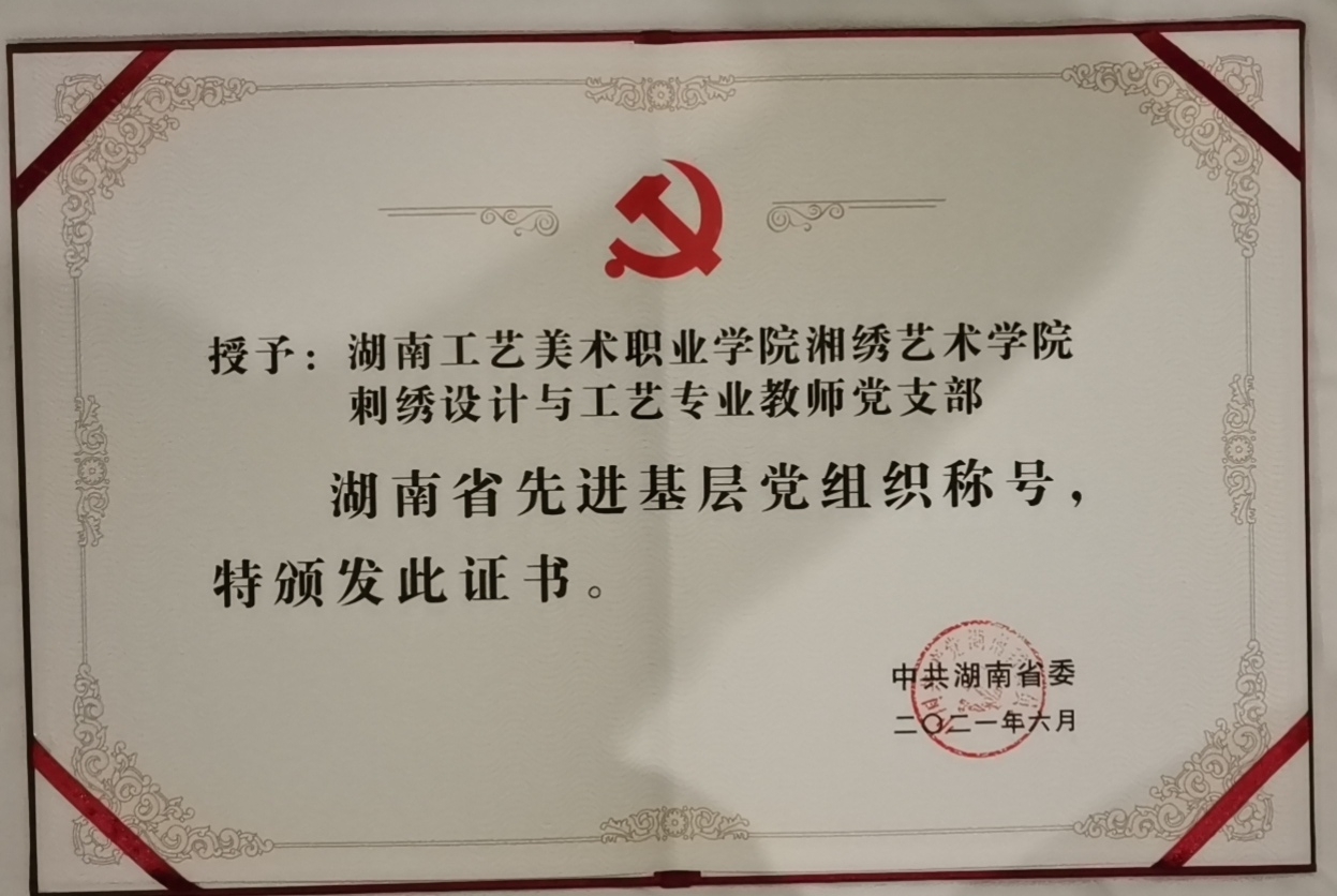 刺绣设计与工艺专业教师党支部“湖南省先进基层党组织”荣誉证书