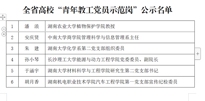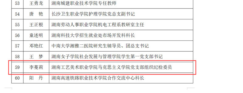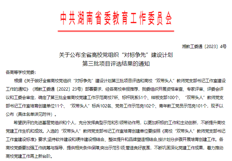 近日,湖南省委教育工委公布了第三批全省高校党建工作示范高校、标杆院系、样板支部及“双带头人”标兵、党务工作示范岗、青年教工党员示范岗评选结果,我支部组织纪检委员李蔓莉同志获评第三批全省高校“青年教工党员示范岗”。