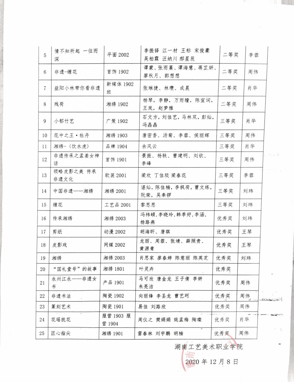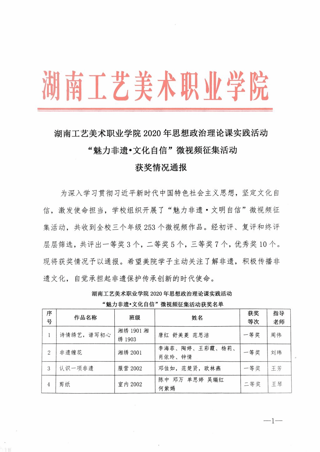近日,由马克思主义学院承办的“魅力非遗•文化自信”微视频征集活动圆满结束。经过两轮评选,最终湘绣1901班唐红团队《诗情绣艺,谱写初心》等3个作品获得一等奖;室内2002班陈中团队《剪纸》等5个作品获得二等奖;广策1902班石文方团队《小郁竹艺》等7个作品获得三等奖;湘绣2003班冯祎頔团队《传承湘绣》等10个作品获得优秀奖。
