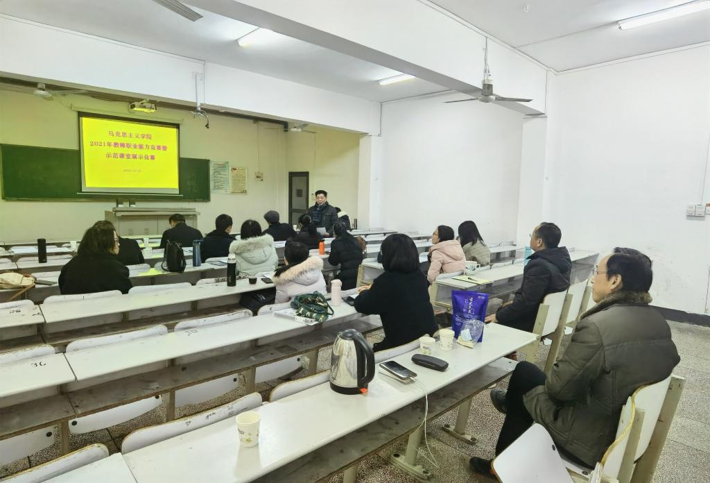 1月12日下午,马克思主义学院2021年教师职业能力比赛暨示范课堂展示竞赛在蕴美楼203教室举行。学校副校长彭泽立,宣传统战部部长、党政办公室主任杨金辉,教学督导李碧高、周学文,教务处副处长李虹霞,马克思主义学院副院长王芳担任比赛评委。马克思主义学院所有专任教师组成8支团队参加了本次比赛。