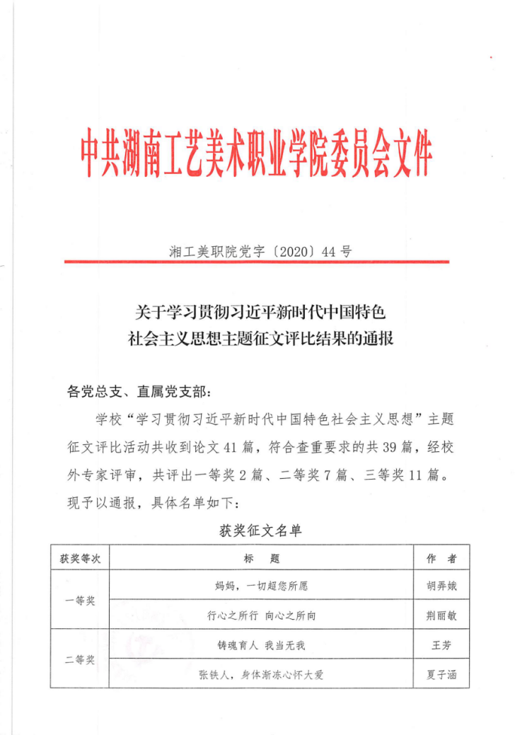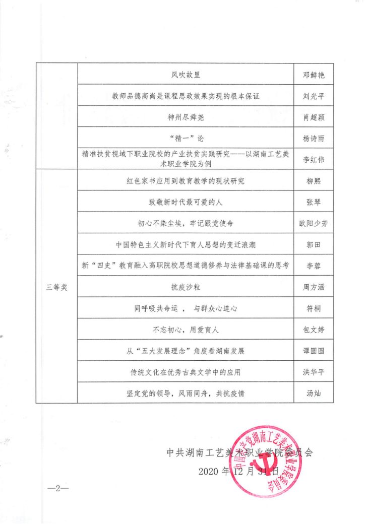 2020年12月31日,学校2020年关于学习贯彻习近平新时代中国特色社会主义思想主题教育征文比赛结果揭晓,马克思主义学院教师王芳的征文《铸魂育人 我当无我》获得二等奖,张琴的征文《致敬新时代最可爱的人》、郭田的征文《中国特色社会主义新时代下育人思想的变迁浪潮》和李蓉的征文《新“四史”教育融入高职院校思想道德修养与法律基础课的思考》荣获三等奖。此次比赛共收到论文41篇,经过查重、校外专家评审,共20篇论文获奖。