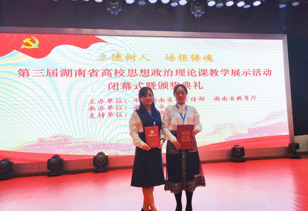 5月22日上午,第三届湖南省高校思想政治理论课教学展示活动现场教学展示在湖南工业大学举行。我校教师李蔓莉、邹杰婷在《毛泽东思想和中国特色社会主义理论体系概论》和《思想道德修养与法律基础》两门课程高职高专组选手中脱颖而出,分别斩获一等奖和二等奖。李蔓莉老师进入该赛事国赛集训。
