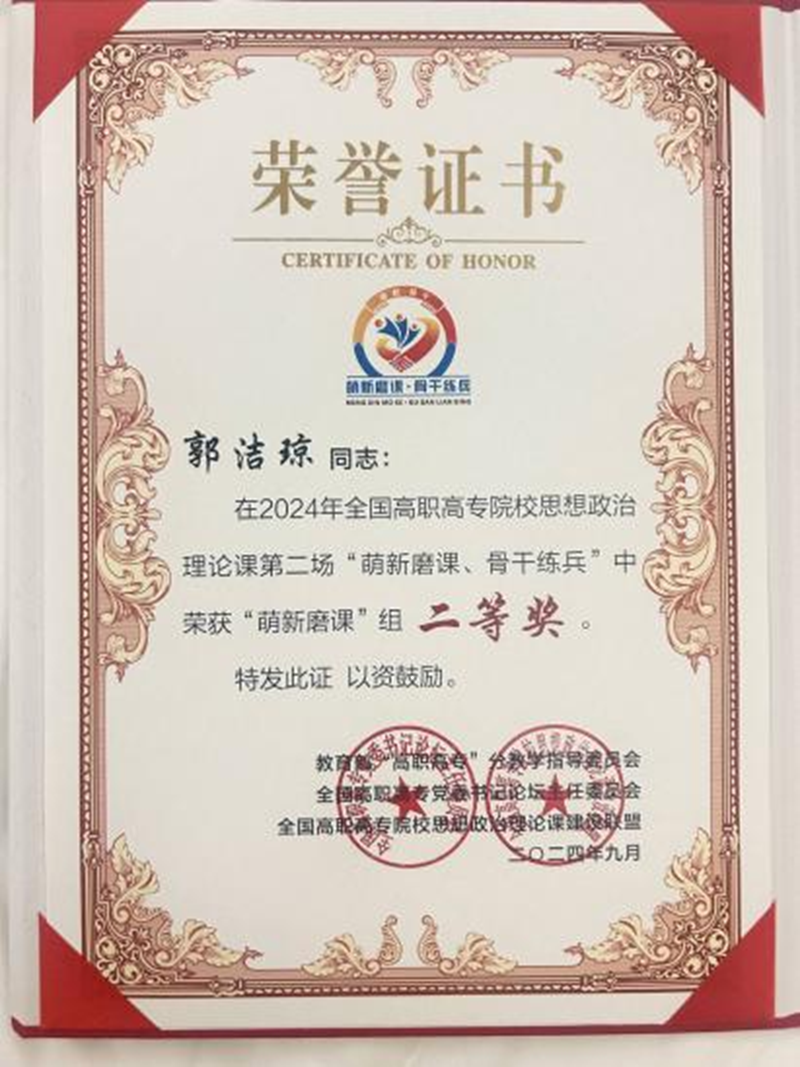 据悉,该赛事为教育部高等学校思想政治理论课教学指导委员会“高职高专思想政治理论课”分教学指导委员会、全国高职高专党委书记论坛主任委员会、全国高职高专院校思想政治理论课建设联盟联合举办,设“萌新磨课”“骨干练兵”两个赛道,分省级初赛、全国复赛、全国决赛三个阶段。郭洁琼老师在省级初赛中获得特等奖,被推荐参加全国复赛,在入围全国复赛的89个作品中脱颖而出获二等奖。
