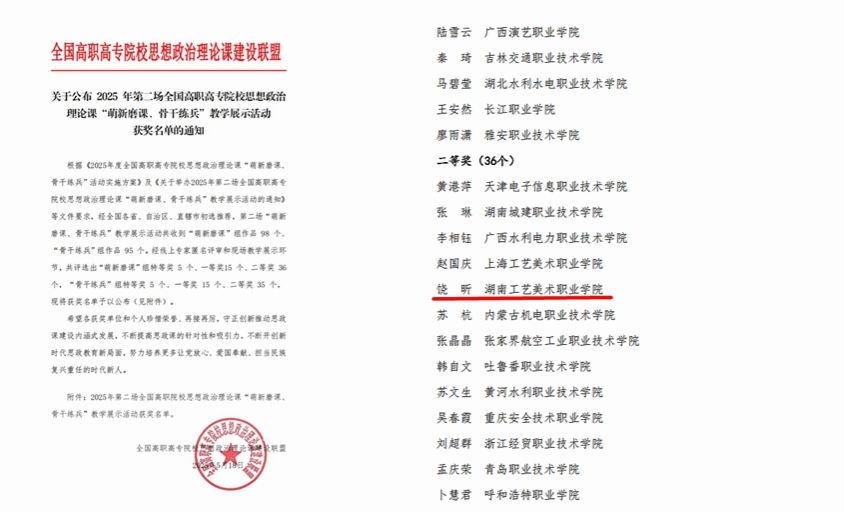 近日,2025年全国高职高专院校思想政治理论课第二场“萌新磨课、骨干练兵”活动结果揭晓,学校思政课教师饶昕荣获“萌新磨课”组二等奖。