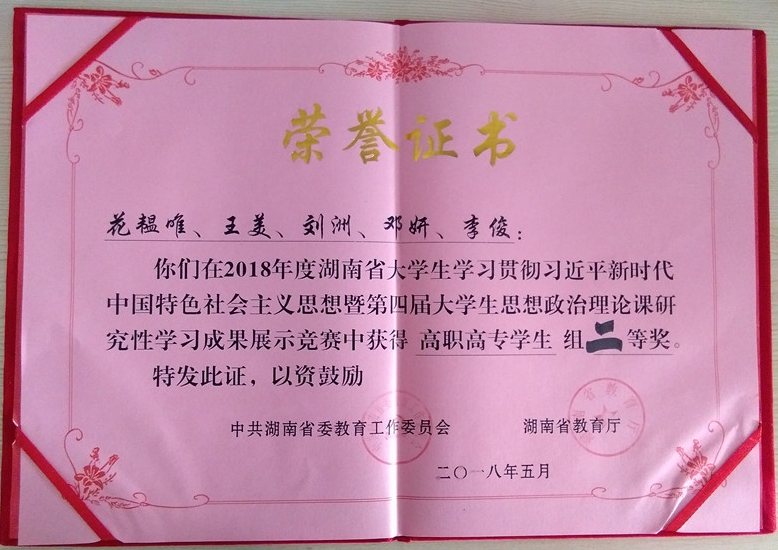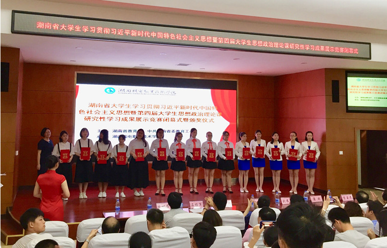 5月27日,湖南省大学生学习贯彻习近平新时代中国特色社会主义思想暨第四届大学生思想政治理论课研究性学习成果展示竞赛高职高专组决赛在湖南机电职业技术学院举行。我校陶艺绘画1702班花韫唯领衔的研究性学习小组的成果展示《培育工匠精神,实现青年成才——以艺术设计类高职学生为例》荣获二等奖,是该赛事举办四届以来我校取得的最好成绩。