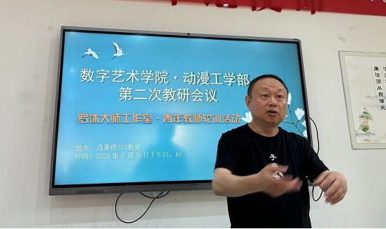 4月21日下午,数字艺术学院国家一级导演罗沐大师参与动漫工学部第二次教研活动,并开展罗沐大师工作室“青年教师轮训”活动。本次教研活动由动漫工学部主任鲁敏主持,全体动漫设计工学部青年教师与学生参与。该活动以立足于湖湘文化,打造“益阳故事”文化IP为出发点,探讨了益阳故事动画剧本的创作思路及方法。