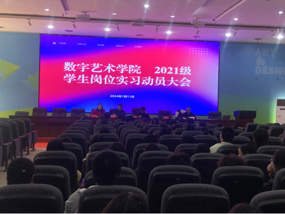 2024年1月11日,数字艺术学院在致美楼五楼学术报告厅召开了2021级学生岗位实习动员大会。数字艺术学院党总支书记邱学文、院长燕晓山、副院长刘杨、毕业设计指导教师、毕业班级辅导员、300多名毕业班学生,以及湖南乐玩无限网络科技有限公司总经理罗毅参加了本次动员大会。会议由学院副院长刘杨主持。
