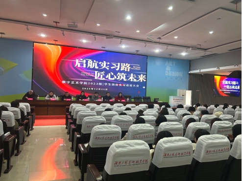 为明确实习方向、强化实践保障,助力学子平稳衔接校园与职场,扎实开启职业成长首站,2025年12月11日,数字艺术学院2023级学生岗位实习动员大会在致美楼五楼学术报告厅如期举行。学院党总支书记邱学文、院长燕晓山、党总支副书记葛慧、副院长刘杨,辅导员老师、岗位实习指导老师、教务干事,湖南源设动漫设计有限公司、武汉知行合一文化有限公司、湖南华橙东方文化有限公司企业代表及2023级全体实习学生参会,共同为实习工作有序开展筑牢基础。