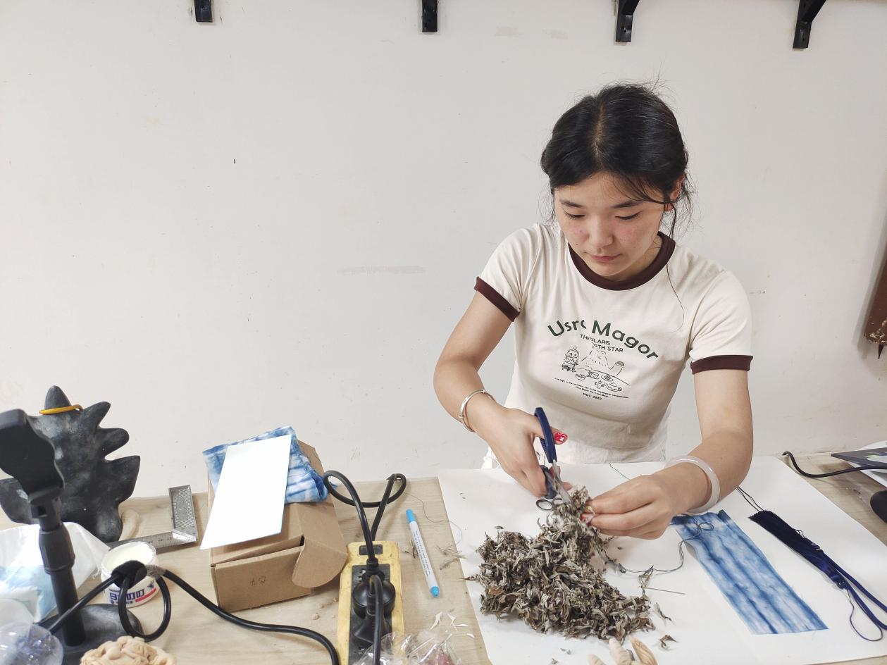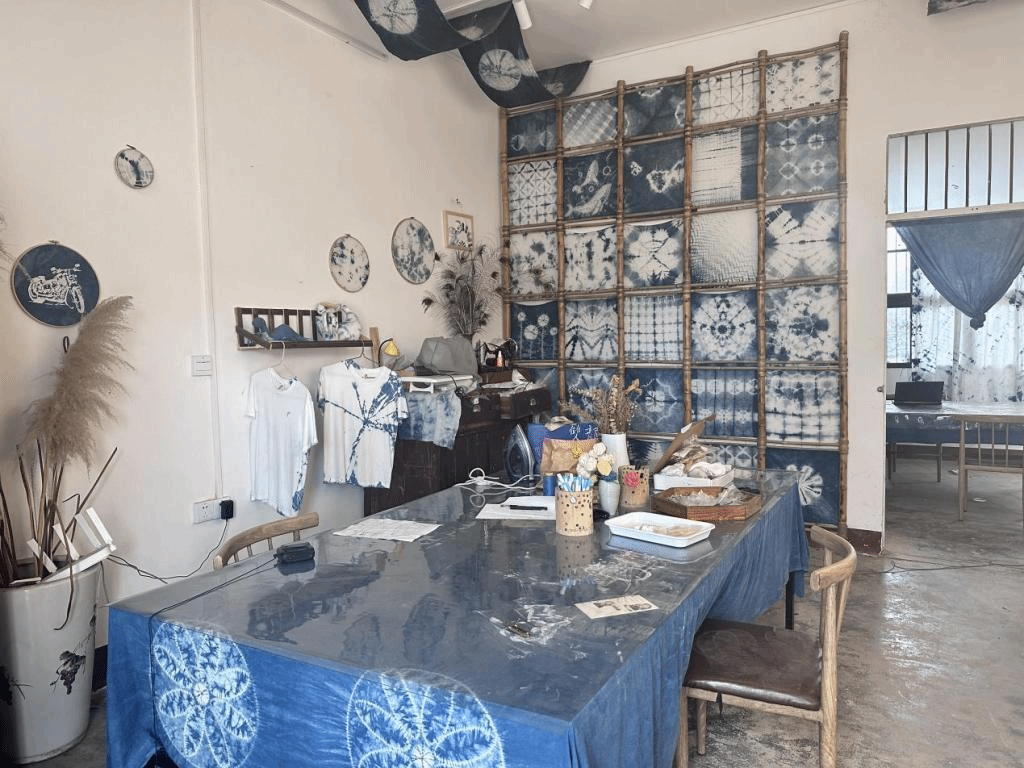 团队负责人之一赵天晴领着团队参观了工作室并展示了非遗文化蓝染工艺以及各种精巧小件与大气的陶瓷摆件、手工木制品、还有各种小郁竹艺展品。