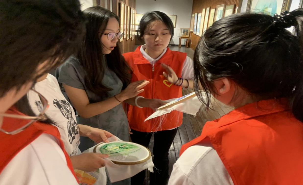 志愿者们为前来博物馆参观的中小学生进行刺绣体验教学