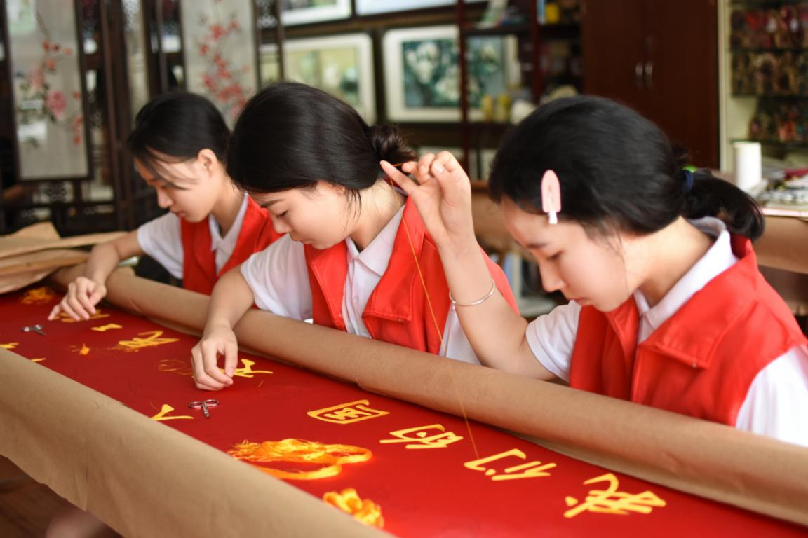 志愿者们进行绣品绣制