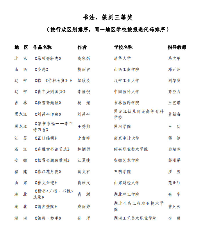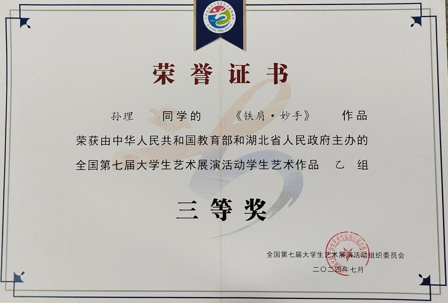 近期,全国第七届大学生艺术展演 (简称全国大艺展)于湖北省襄阳市举行。我校孙理同学的艺术作品类书法、篆刻《铁肩·妙手》在指导老师李照的带领下荣获由中华人民共和国教育部和湖北省人民政府主办的全国第七届大学生艺术展演活动学生艺术作品乙组三等奖!在省级展演中,江一材、彭越和康诗琪同学的作品在湖南省第七届大学生艺术展演活动中分别荣获二等奖和三等奖!