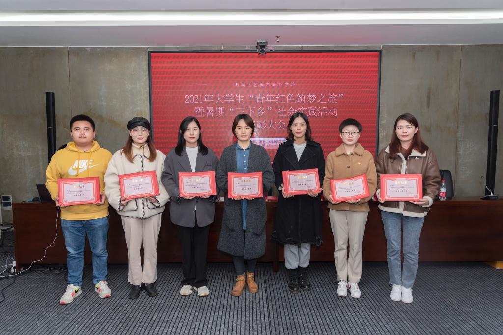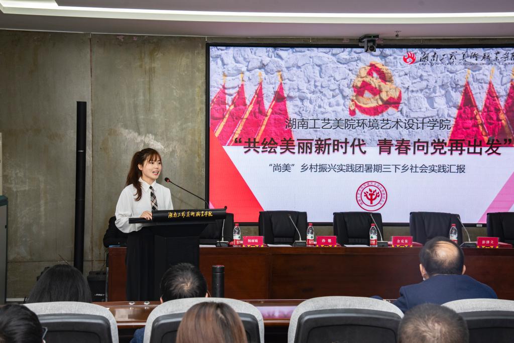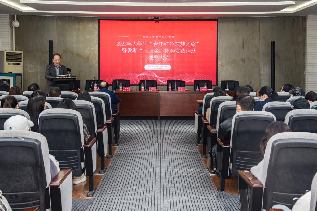 校团委书记孙魁作《2021年暑期“三下乡”社会实践工作总结报告》。今年,学校共组建11支校级实践队、30支院级调研队,575名师生分赴贵州省贵阳市、益阳安化县尤溪村以及其他社区乡镇。他们用支教帮扶孩子们筑梦未来,用农事体验实践与乡村调查相结合,助力乡村振兴,或发挥专业特长,描绘新农村风貌,感受新时代乡村巨变。