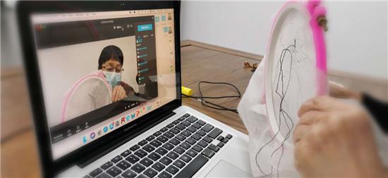 湘绣艺术学院教师通过网络直播,引导同学们打破固有的湘绣工具材料的传统思维,鼓励同学们积极展开创新,思考如何在没有绣绷的情况下使刺绣底料平整,如何在没有丝线的情况下运用家中现有棉线、绒线、丝带等练习技法。