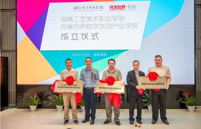 随后,双方代表签订校企战略合作框架协议并为 " 两中心、两基地 "(游戏动漫类师资培训中心、"1+X" 证书—游戏美术设计职业技能等级证书培训考证中心、完美世界数字媒体艺术设计创新基地、游戏与动漫设计创新基地)举行授牌仪式。最后,领导嘉宾共同为数字文创产业学院揭牌。