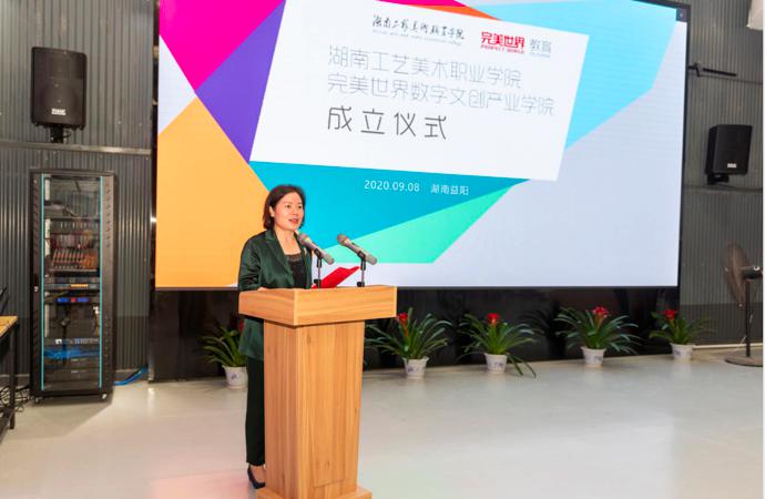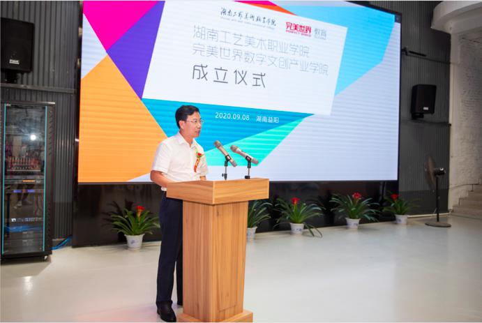学校校长陈鸿俊从建设意义、建设目标、建设内容和预期成效等四个方面详细阐述了数字文创产业学院的建设规划。他指出,学校将与完美世界教育开展深度合作,将数字文创产业学院打造成校企共建专业、共育人才、共同研发、共赢发展的合作平台,打造成为湖南高职院校产业学院建设的典范。