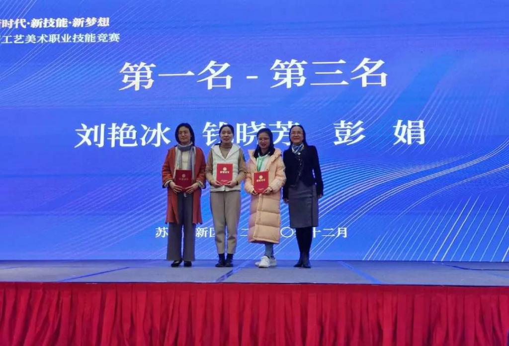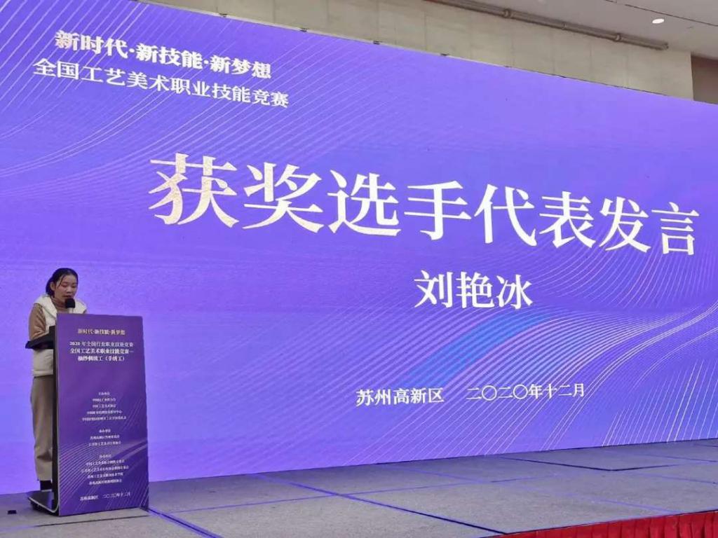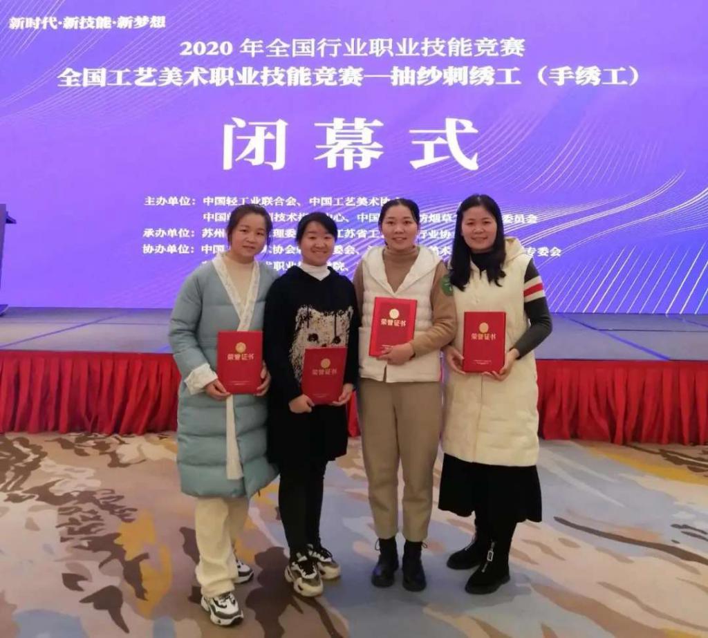 在刚刚结束的 2020 年全国行业职业技能竞赛——全国工艺美术职业技能竞赛(抽纱刺绣工)中,湖南工艺美院湘绣艺术学院教师刘艳冰、刘霞、罗剑英、吴晶慧(湘绣专业留校毕业生),分别获得第一、五、七、九名的优异成绩;另外 4 名湖南代表队成员彭娟、周偲、李小艳、田春艳系湘绣艺术学院往届毕业生,代表其单位参赛并获得了第三、六、十七、二十六名的好成绩。