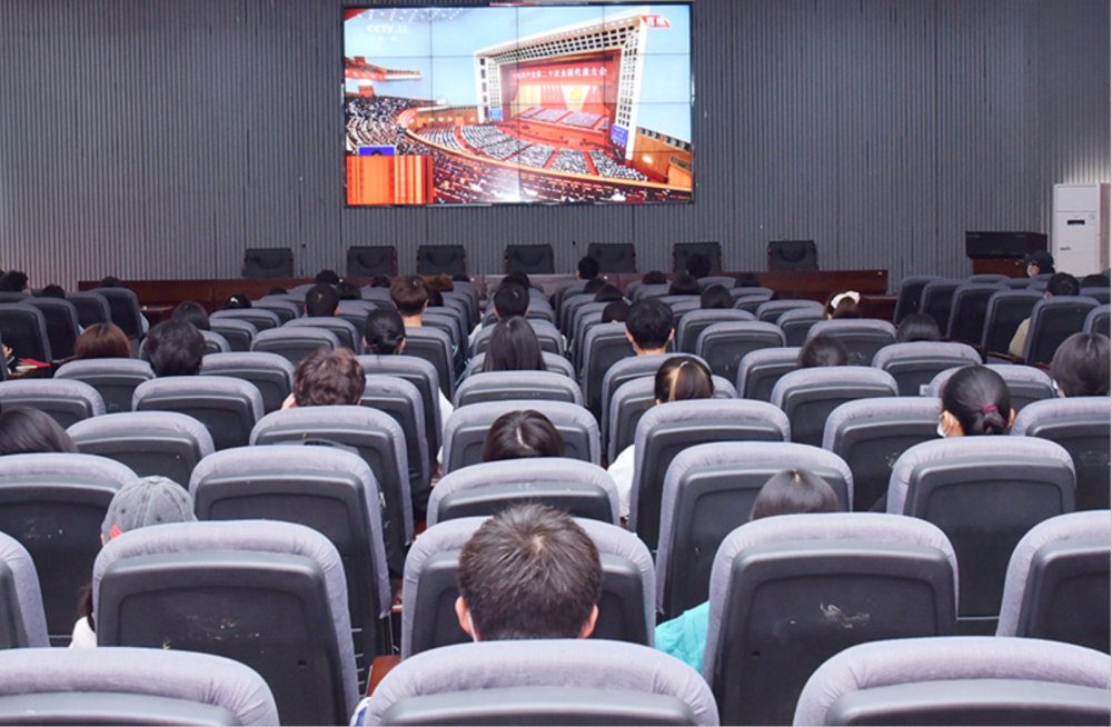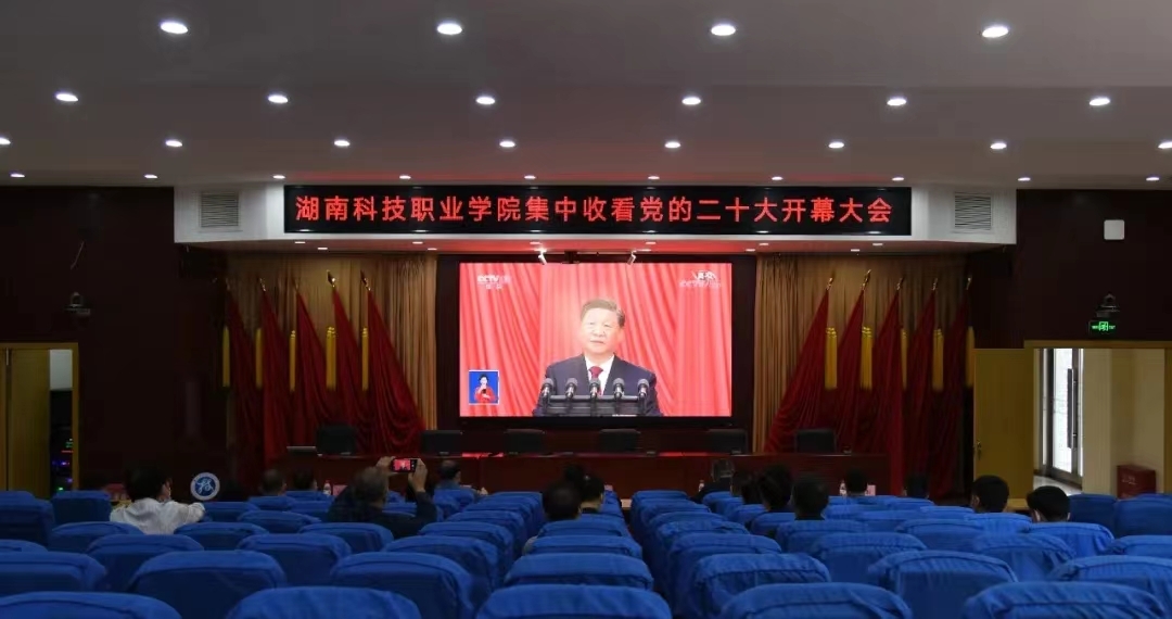 在湖南科技职业学院,师生们集聚在多功能报告厅、会议室、教室内,通过集中收看与个人收看的方式,聆听和学习党的二十大报告。