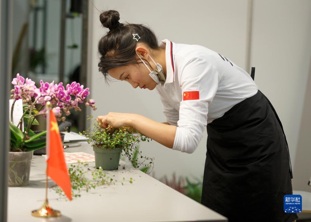 10月20日,上海农林职业技术学院杨灵芝在芬兰首都赫尔辛基参加2022年世界技能大赛特别赛芬兰赛区比赛花艺项目。新华社发(卡勒·帕尔基宁摄)