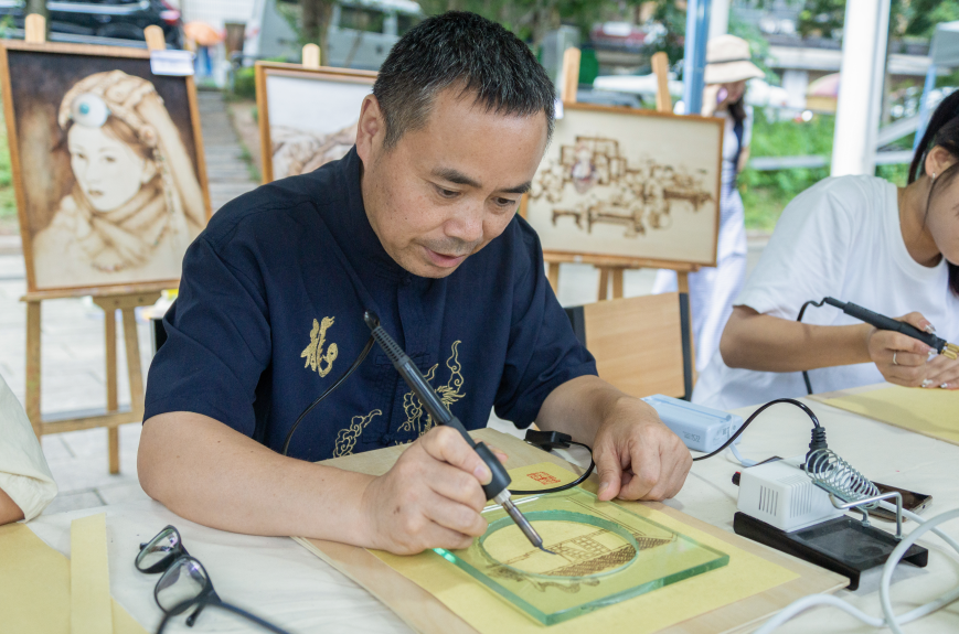 在益阳市美术馆广场,非遗大师和弟子们依次摆开展台,展示手中技艺。每个展台前都被前来观展的领导嘉宾、市民朋友围了起来,亚太地区手工艺大师、国家级非物质文化遗产项目(湘绣)代表性传承人刘爱云,国家级非物质文化遗产项目(花瑶挑花)代表性传承人奉雪妹,湖南省工艺美术大师、省级非物质文化遗产项目宝庆烙画的代表性传承人唐文林等大师纷纷亮出绝活,湘绣技艺细腻传神、花瑶挑花古老精美、宝庆烙画技艺独特,让现场观众沉浸式体验了非遗文化的独特魅力。